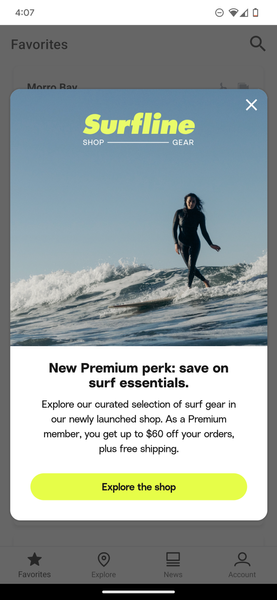 We tested using the Drag and Drop modal editor for announcing Surfline’s new ecommerce store to users on web and app.