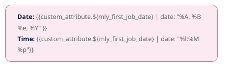 {{job_promise_date }}I'm not sure why the time liquid doesn't work though. I tried adding the same input and it worked for me. It would be helpful if you had logs of those API calls to see the actual values that are being passed.