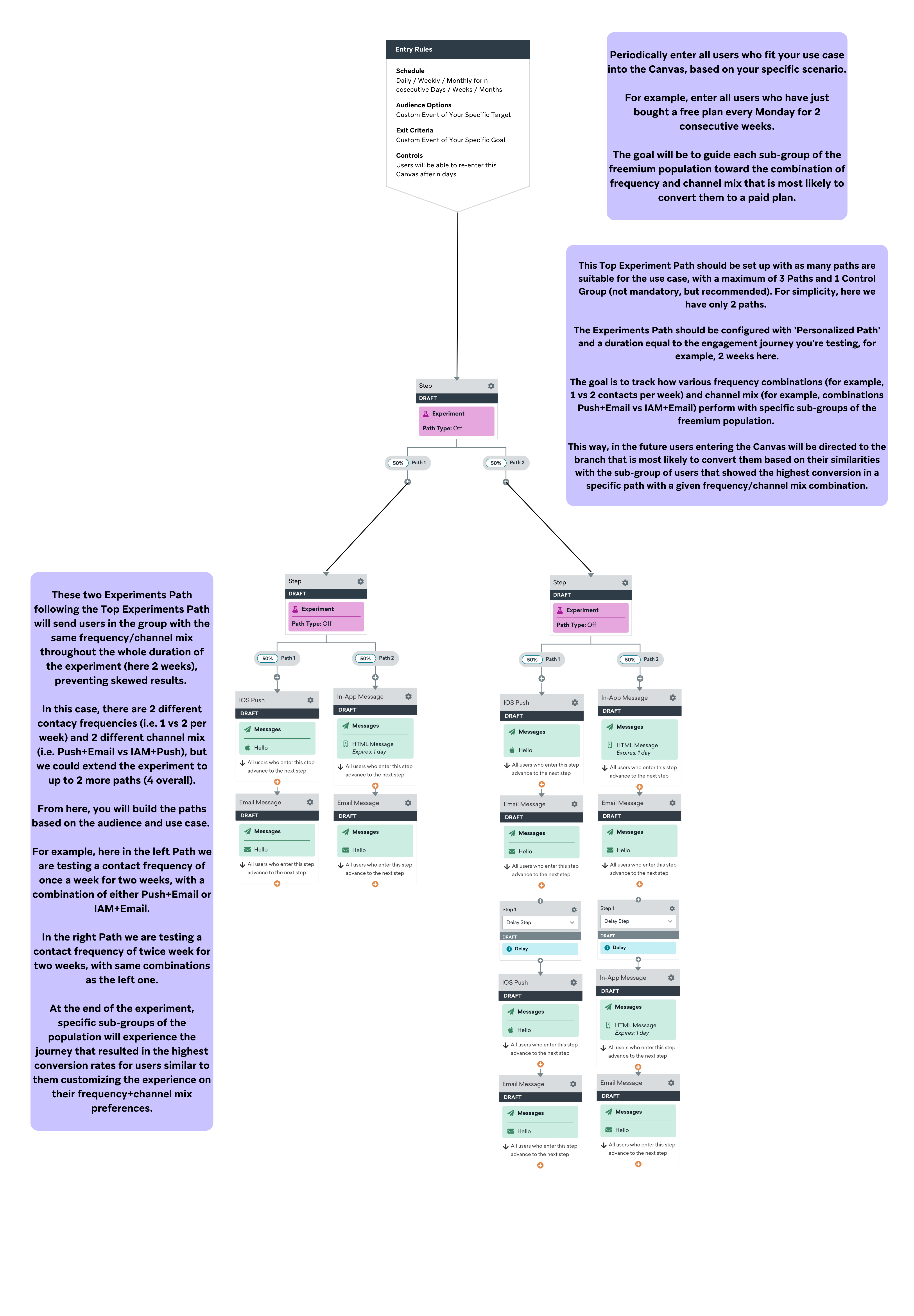 This Canvas serves as a starting point for setting up an experiment aimed at sending specific sub-groups of a user population down the engagement journey that has the highest likelihood of converting them.