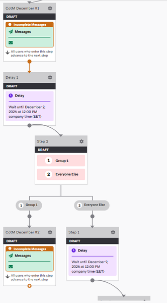 I am having a bit of a trouble with orchestrating an email campaign using Audience Paths. The plan is the following. Send 4 emails, each email with a delay and to a different segment. The 1st email is simple/easy and straight forward. It is sent to audience selected at the beggining.