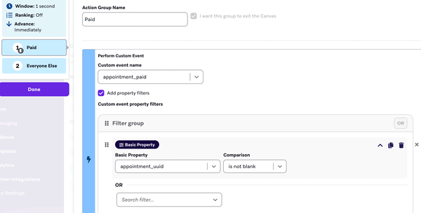 Then a added an Action step checking if there is an appointment_paid (custom event) for that specific appointment_uuid (property). If yes, the user exits the canvas, if not, he receives the Payment Reminder message.