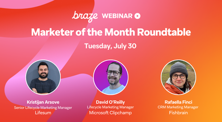 Join us for our first ever Marketer of the Month Roundtable with Kristijan, DavidO, and Rafinci. Join this new webinar series each quarter to hear perspectives from Braze customers like you as curated by the Braze Learning team. We'll covering a variety of topics each quarter depending on the perspectives our Marketers of the Month would like to share, including but not limited to: Exploration of recent Campaigns or Canvases run in Braze - their objectives for the Campaign or Canvas, how they set it up in Braze, how it went, and what they learned Details on their onboarding, retention, win back, and churn strategies, including the areas of focus for their brand, how they implement their winning strategies in Braze, and what they've learned so far How they get the most out of Braze products, including their objectives in using different products, how they get the most out of them, the value derived, and what their results or learnings have been so far Our July 30th webinar is in production now with Braze users from Microsoft Clipchamp, Lifesum, and Fishbrain. Register here Can't join us live? No worries! We'll share out a recording afterwards.422Views3likes1Comment